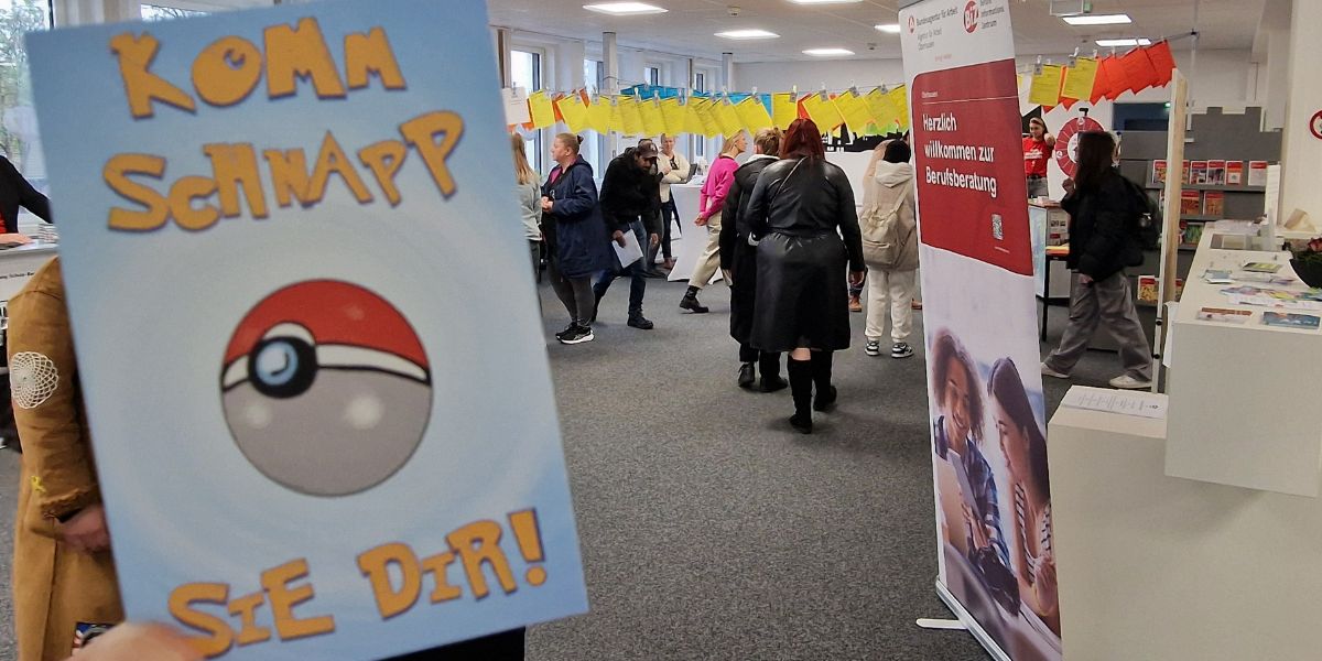 Besonders beliebt bei den Jugendlichen waren die VR-Brillen, mit denen sie neue Berufe entdecken konnten. Gut an kamen auch das Berufe-Pong und das Glücksrad. Doch auch die Informations- und Unterstützungsangebote wie der Bildungswegenavigator oder der Bewerbungsmappencheck wurden reichlich genutzt. Ein Hingucker im BIZ war außerdem die gespannte Wäscheleine mit den vielen bunten Zetteln, an denen der gemeinsame Arbeitgeber-Service der Agentur für Arbeit und des Jobcenters freie Ausbildungs- und Praktikumsstellen präsentierte. Zahlreiche Jugendliche fotografierten sich die für sie interessanten Ausbildungsangebote mit dem Smartphone ab – und wer weiß, vielleicht schnappt sich ja bald auf diese Weise der bzw. die eine oder andere tatsächlich seine Ausbildung!